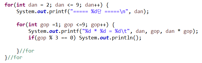 - 형태 : for (초기식; 조건식; 증감식) {수행 코드}